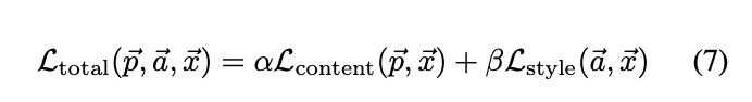 - 따라서 각 레이어마다 style loss + content loss를 계산하고 모든 레이어의 loss값을 합하면 Total loss가 된다. 이때 loss마다 하이퍼파라미터를 곱하여 반영 비율을 조절할 수 있도록 한다.
