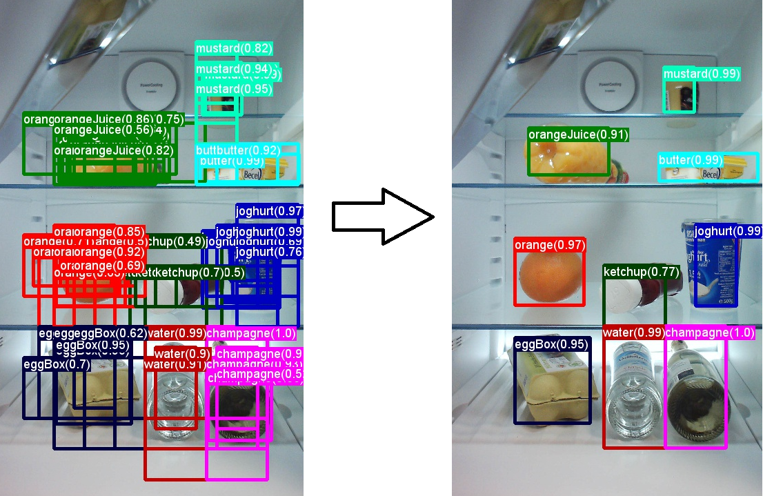 NMS 알고리즘에서 같은 class끼리 IoU가 임계치 이상일 때 낮은 confidence의 box를 제거한다.