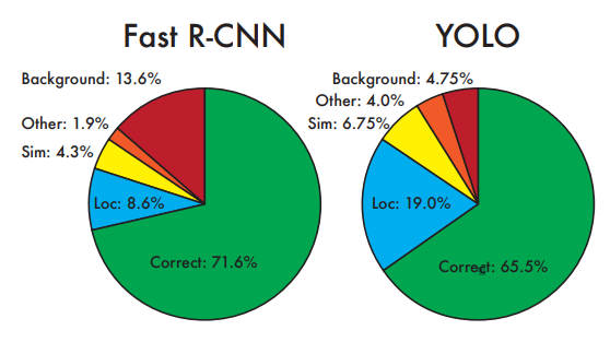 YOLO 모델은 Fast R-CNN 모델보다 background error가 덜 나타났지만, Localization error가 더 많이 나타났다.